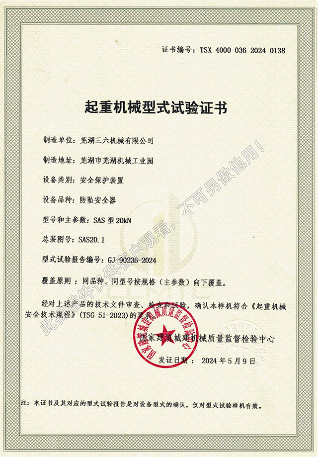 SAS型20kN防墜器型式試驗證書